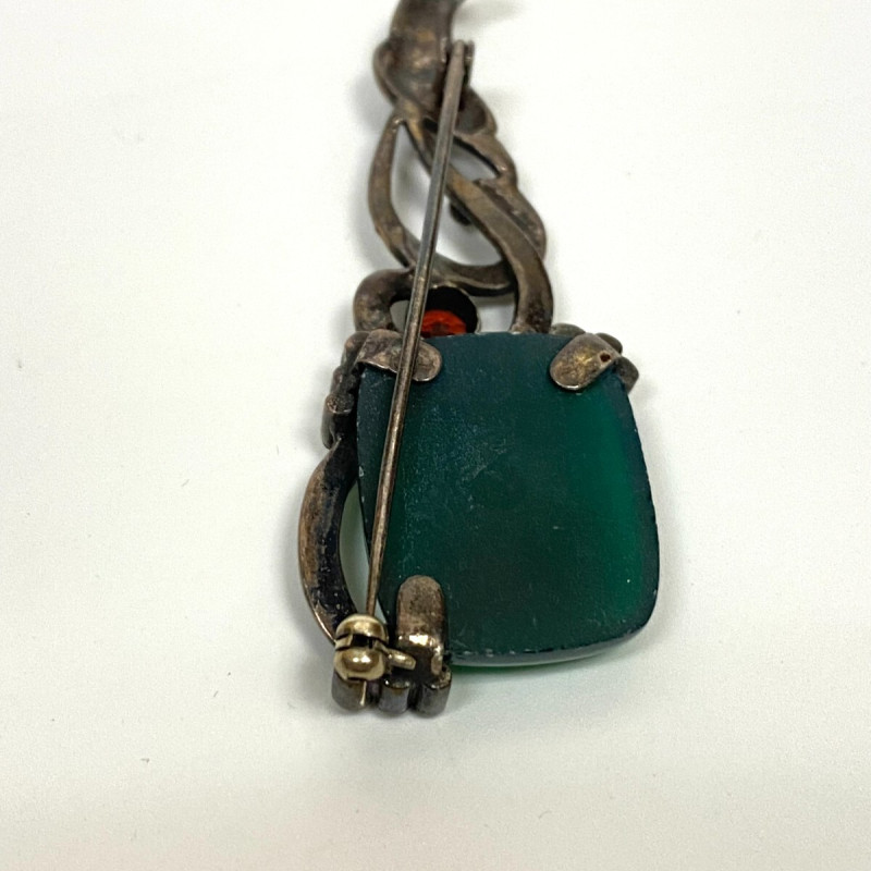 The brooch's metal purity is stamped at 925, ensuring a high-quality silver base that harmoniously blends with the green hues of the jade. Despite its maker's anonymity, the craftsmanship speaks for itself, making this piece a distinctive find for anyone with an appreciation for unique, handcrafted jewelry.